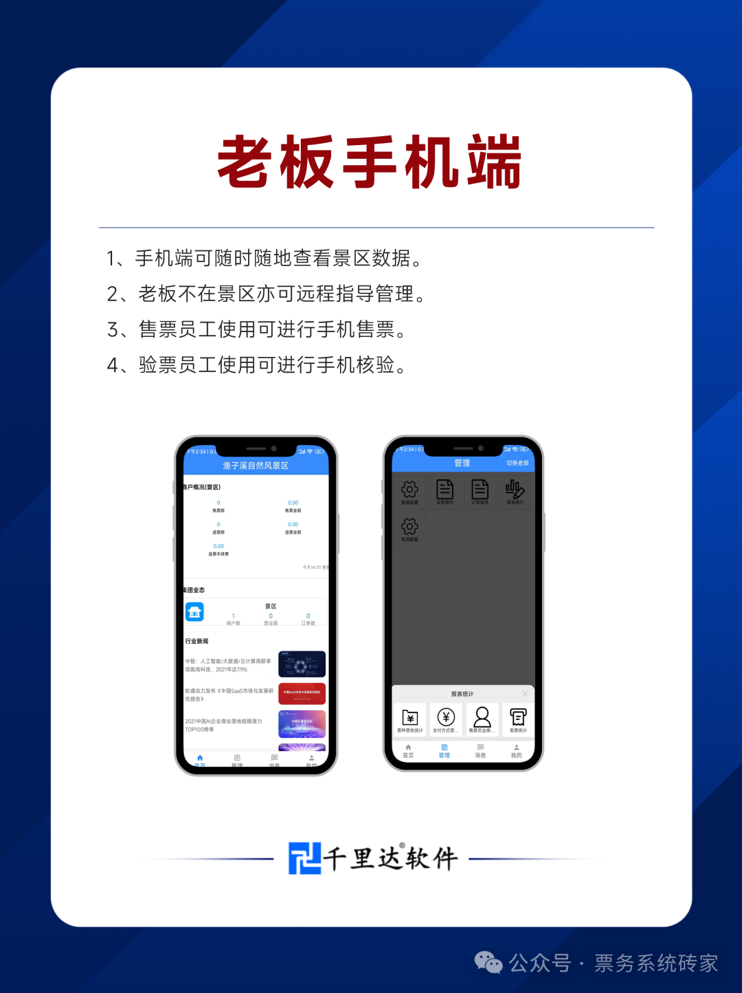 千里达库存管理子系统专注于对厂家已印制好的门票进行高效管理。它涵盖了票型票价管理、门票入库操作、门票领取记录、售票员退库处理、总退库流程以及相关报表的查询与 打印等功能模块。
